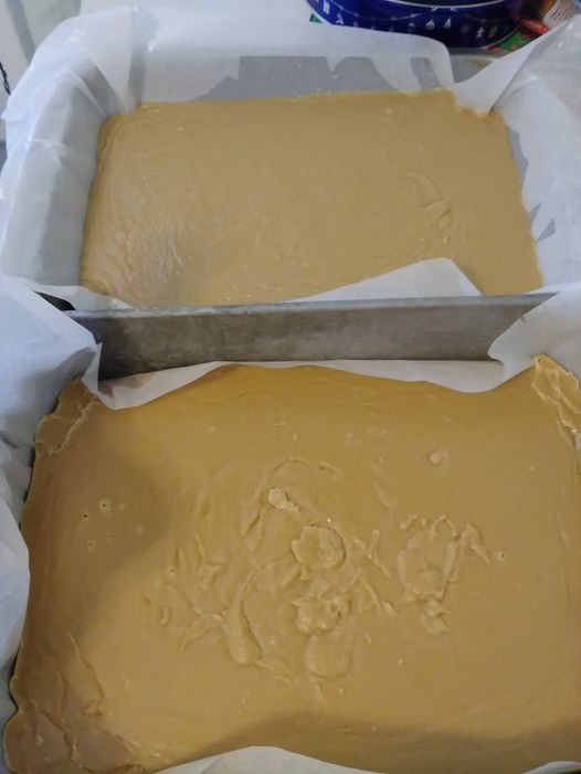 cup of sugar, 1/2 cup of milk, 1 cup peanut butter, 1 tsp of vanilla. Combine sugar and milk in a cooker until a rapid boil and boil for 2 and half minutes. Remove from heat add vanilla and peanut butter and mix until melted. Pour in a greased 8×8 pan. For my pictures I doubled the ingredients and poured into a 11×13 pan.