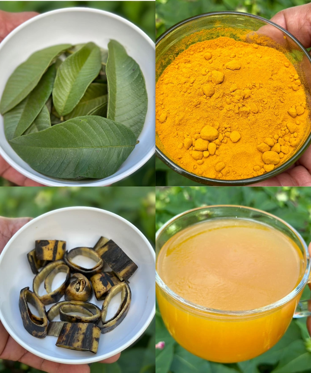 Place the banana peel and guava leaves into a pot, add 3 cups of water, and bring to a boil.