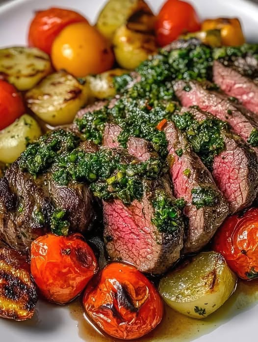A perfectly seared beef tenderloin drizzled with vibrant chimichurri sauce, served alongside roasted potatoes, blistered cherry tomatoes, and tender broccoli—a simple yet elegant dish!