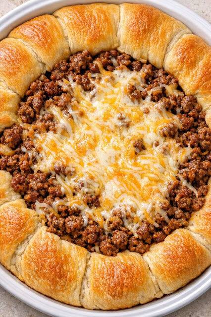 This dish is the definition of nostalgic comfort—flaky crescent dough baked into a golden crust, packed with taco-seasoned beef, and topped with melted cheese. It started as a quick meal in college kitchens and later became a favorite in busy households. It’s the kind of simple, one-dish dinner that proves delicious food doesn’t have to be complicated.