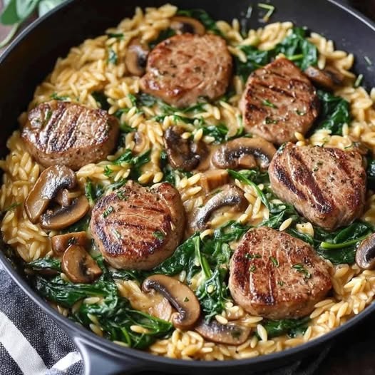 Creamy Pork Tenderloin Medallions with Orzo, Spinach, and Mushrooms in 30 Minutes Using One Pan!