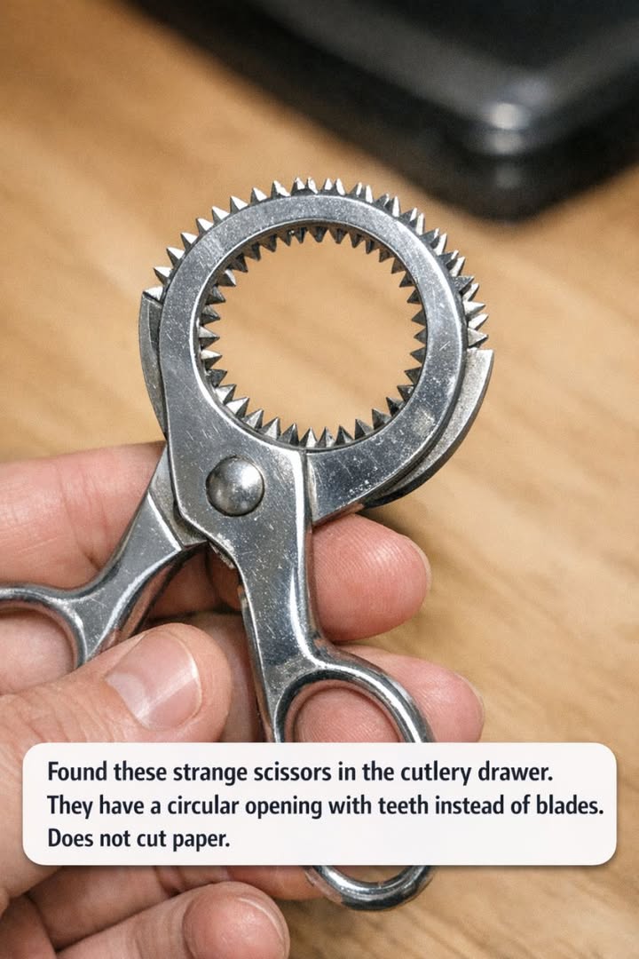 Found these strange scissors in the cutlery drawer. They have a circular opening with teeth instead of blades. Does not cut paper.