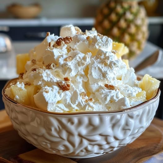 This refreshing Hawaiian Pineapple Coconut Fluff is a perfect summer treat, combining sweet pineapple, creamy coconut, and crunchy nuts,