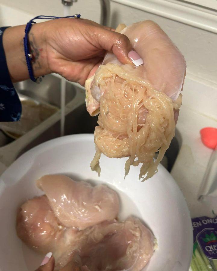 A mother was left completely shocked when the chicken she was preparing for dinner separated into stringy pieces, resembling spaghetti. Expecting a simple chicken dish, she was met with a bizarre surprise — the raw poultry shredded into thin strands as she washed it. Sharing her experience in a viral Facebook post, she speculated, “I think it’s that fake meat,” sparking a wave of online discussions and even inspiring some to consider veganism.